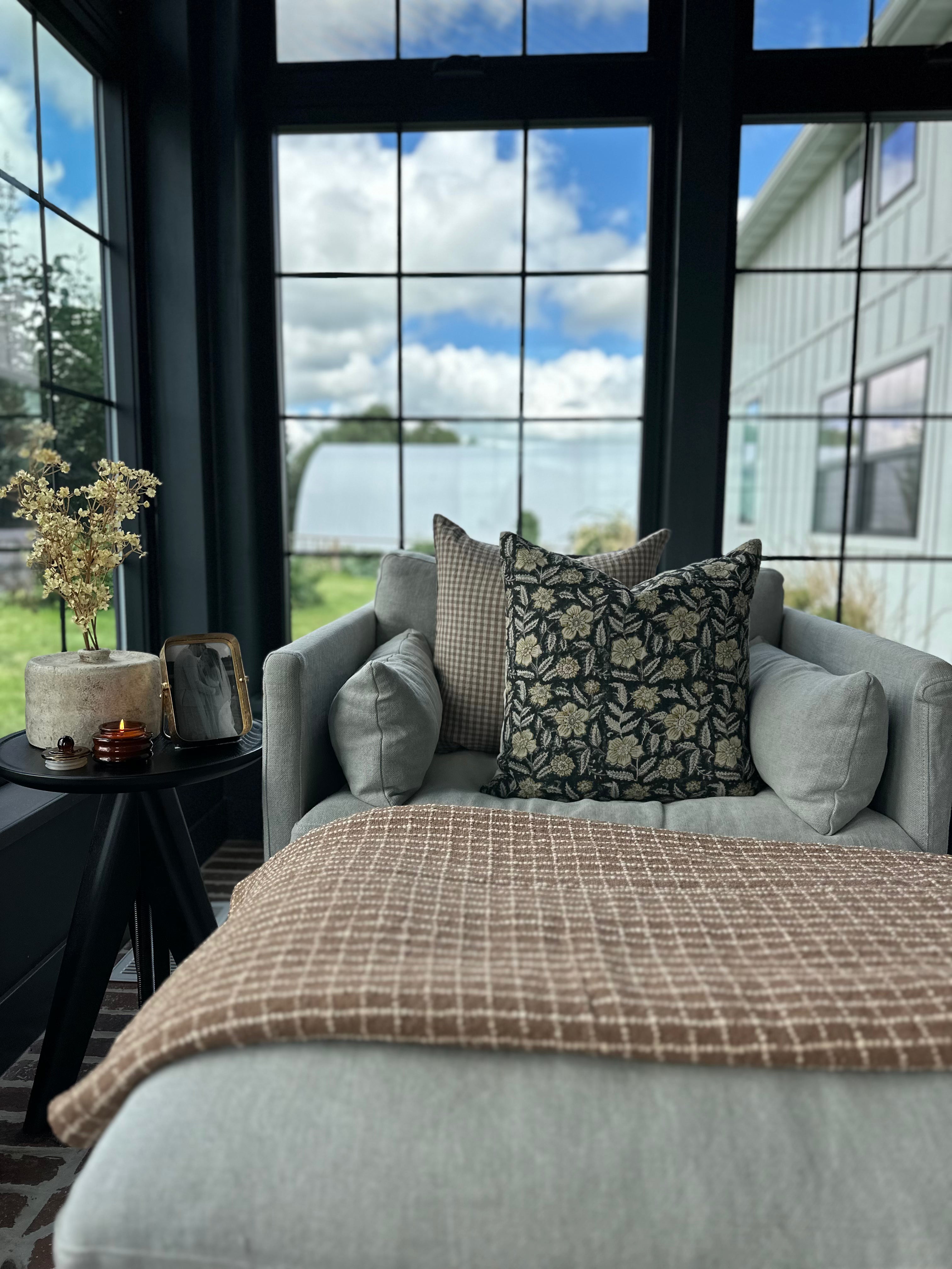 Beige & Brown Gingham Pillow - 20x20 inch size pillow for fall decorating on wicker stool