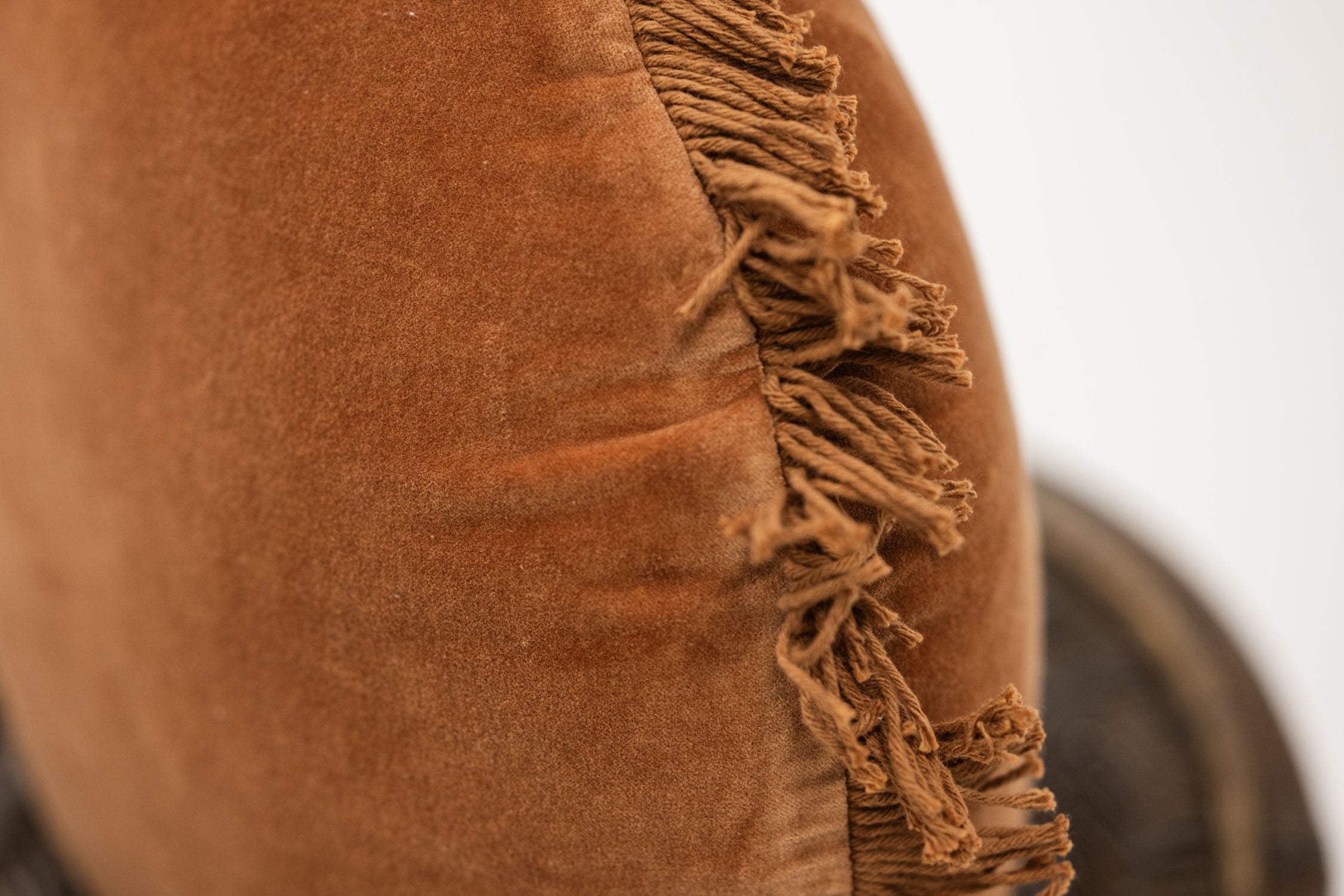 Our round terracotta pillow is made from a beautiful cotton velvet pillow that has a vintage feel, complete with a fringe edging. Pillow zips closed, allowing for the insert to be removed for easier cleaning. This throw pillow looks beautiful on sofas, chairs and beds.