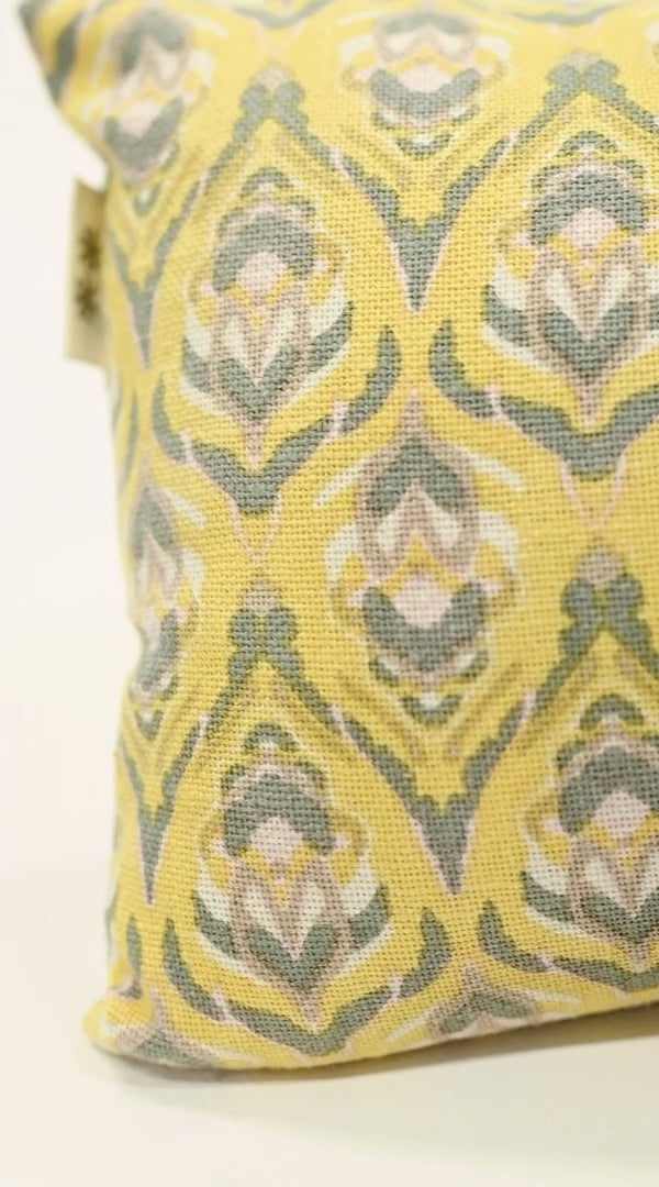 One sided design, block printed pattern from India. A mustard yellow with small repeating Iris pattern.