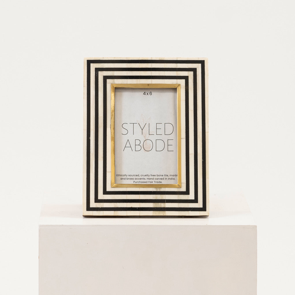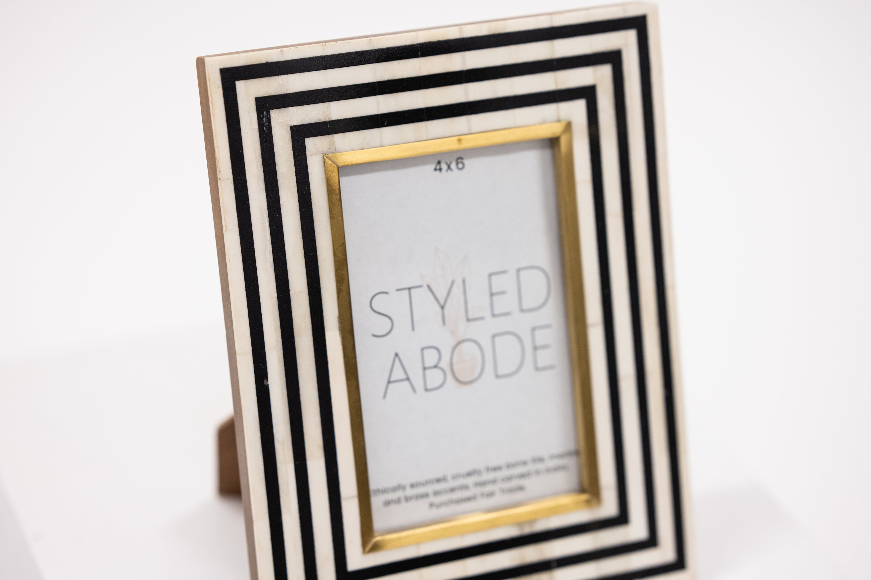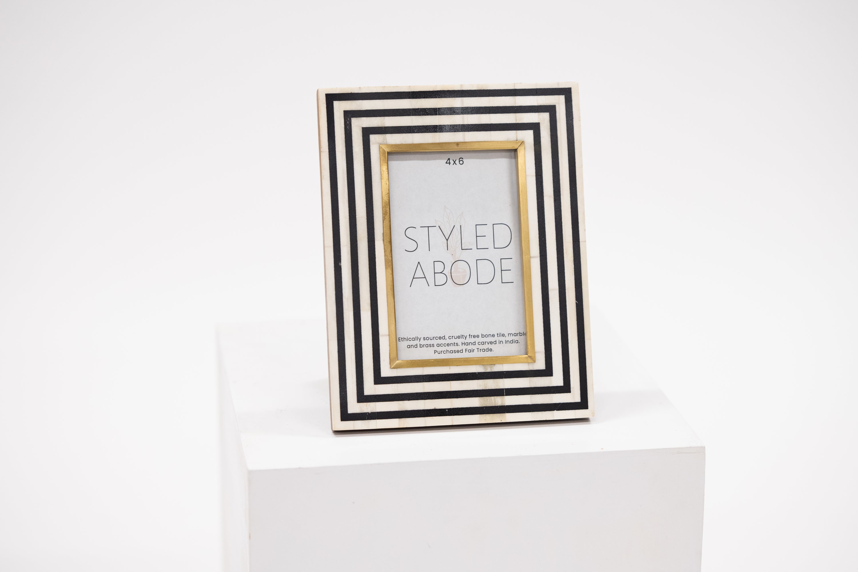 This frame is made from ethically sourced bone and mango wood from India that has been hand carved by Master artisans in Old Delhi. Bone has been arranged in slim tile strips with a brass accent.