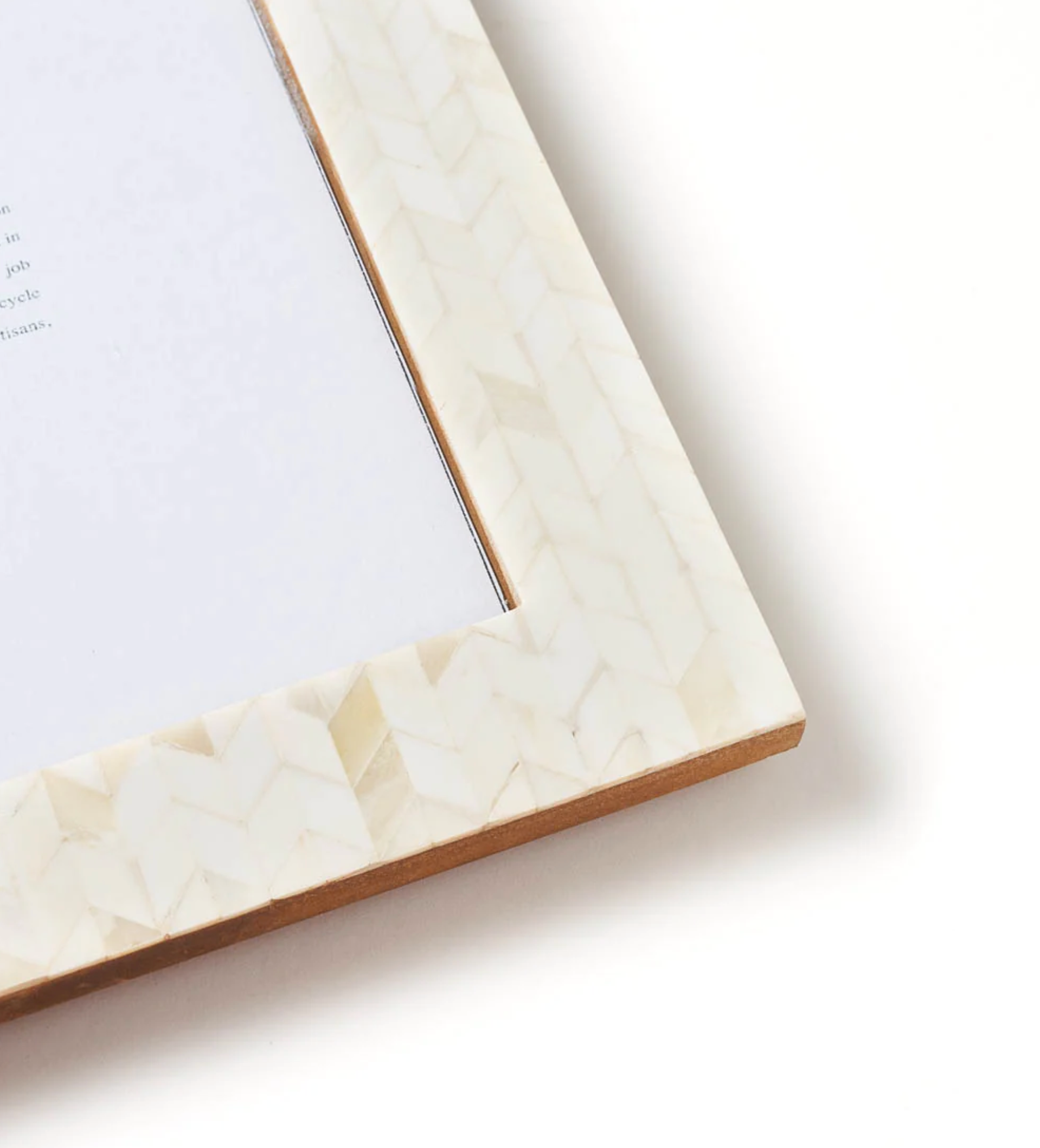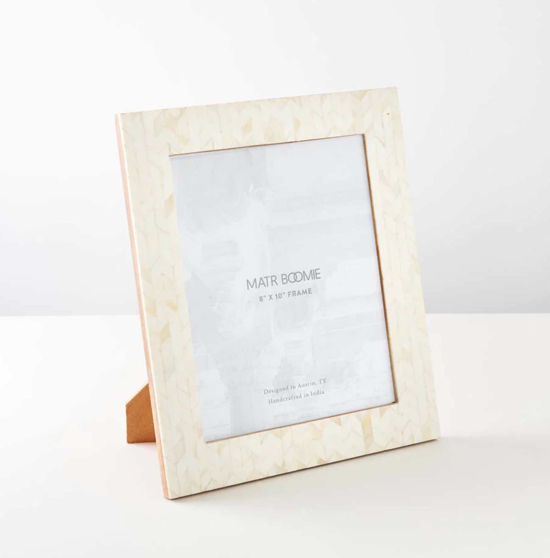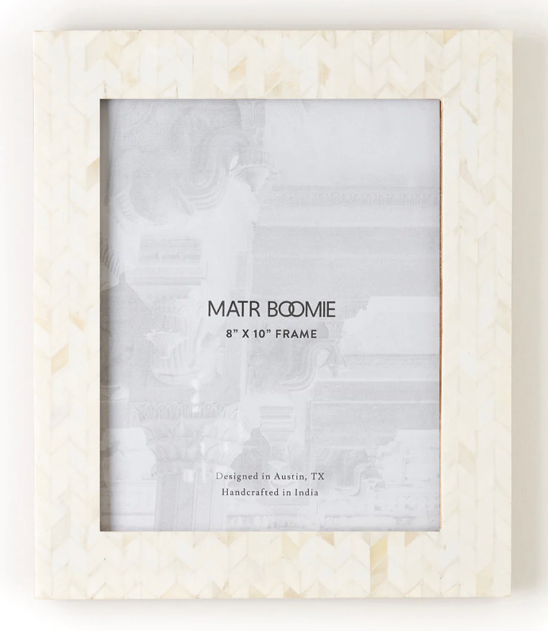 This frame is made from ethically sourced bone from India that has been hand carved by Master artisans in Old Delhi. Bone has been arranged in a herringbone pattern.