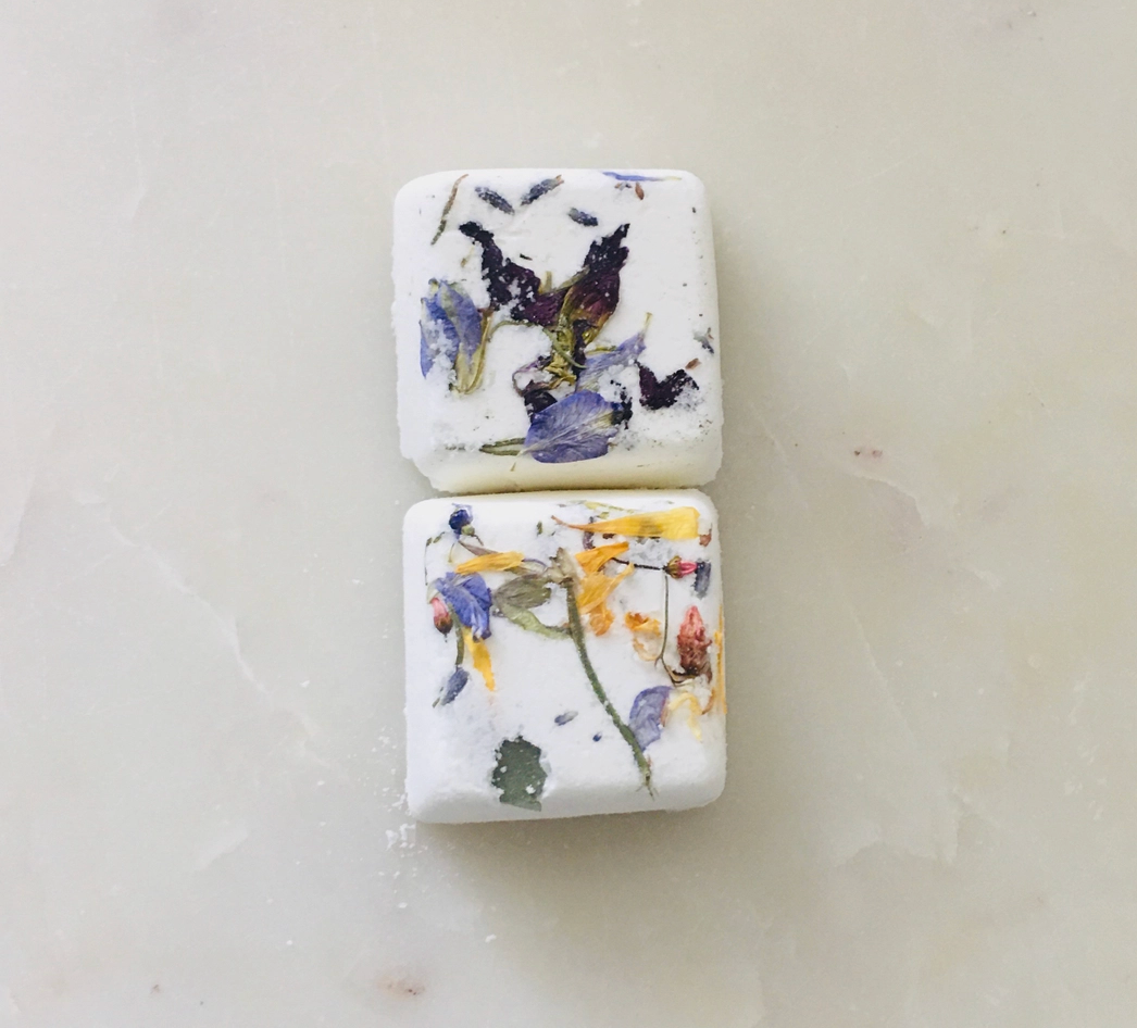 A two pack of aromatherapy shower steamers containing Vanilla, Lavender, and a mix of dried florals. Packaged in a rice paper recyclable pouch.