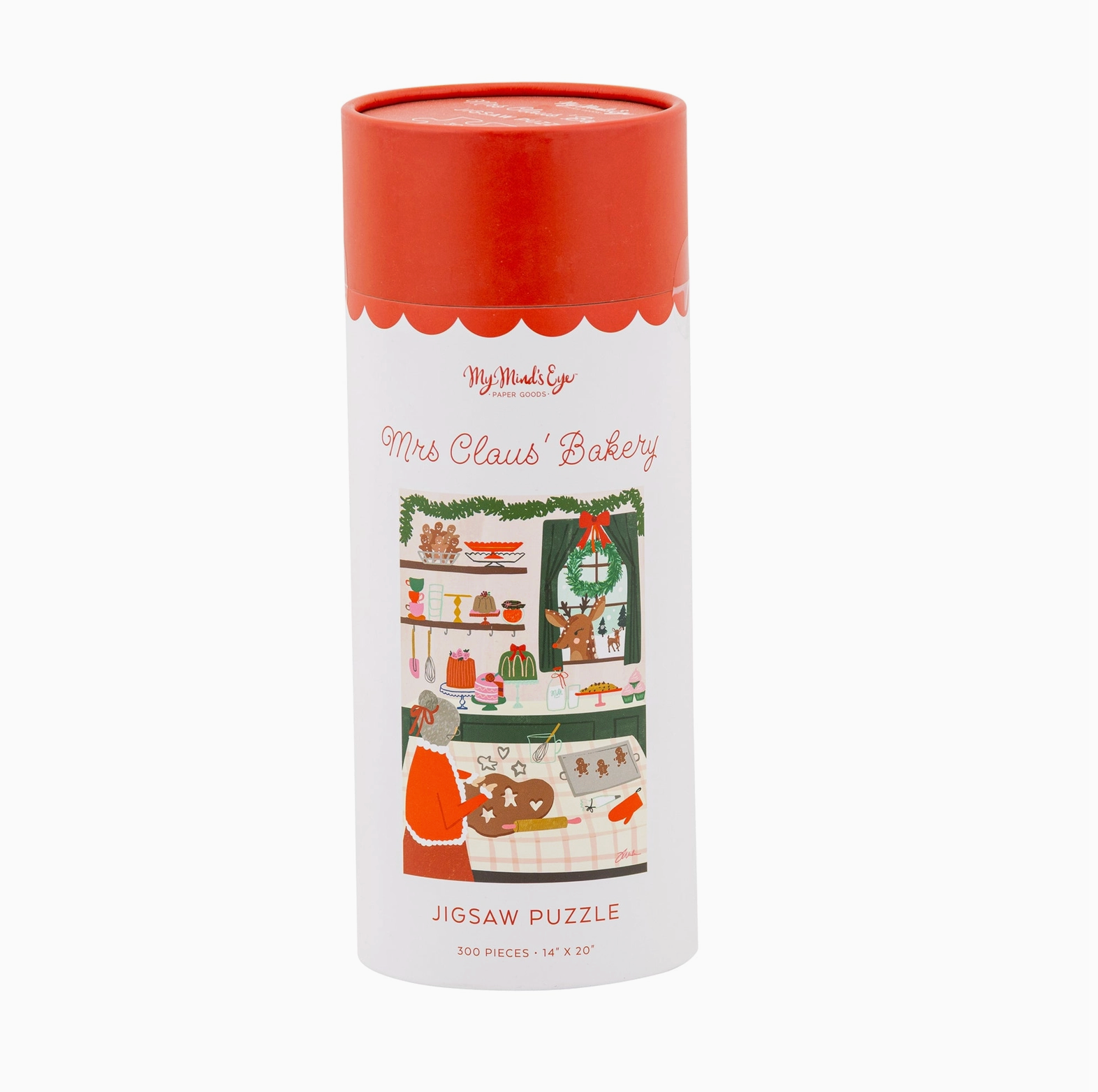 A 300 piece chipboard jigsaw puzzle with a festive Christmas scene. This puzzle features the "Mrs Clause Bakery" scene with Mrs. Clause baking gingerbread men in the kitchen while a reindeer looks on.