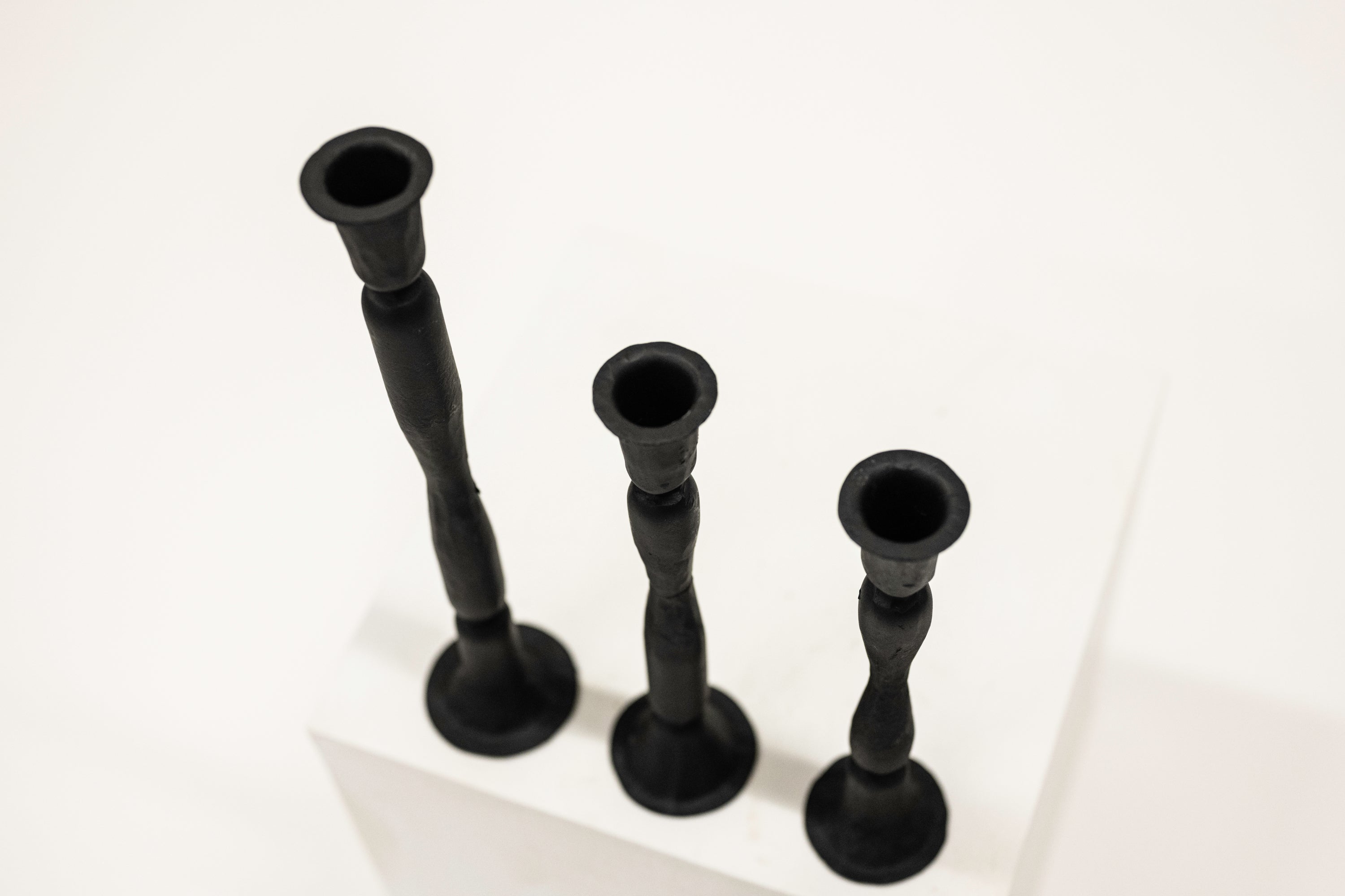 Our set of classically shaped candlestick holders are the perfect way to display your favorite candle tapers. We love using a variety of heights on our mantle and dining table. These candlesticks have been crafted out of forged iron by artisans in India. Bases of candlesticks feature a soft felt pad to prevent scratching.