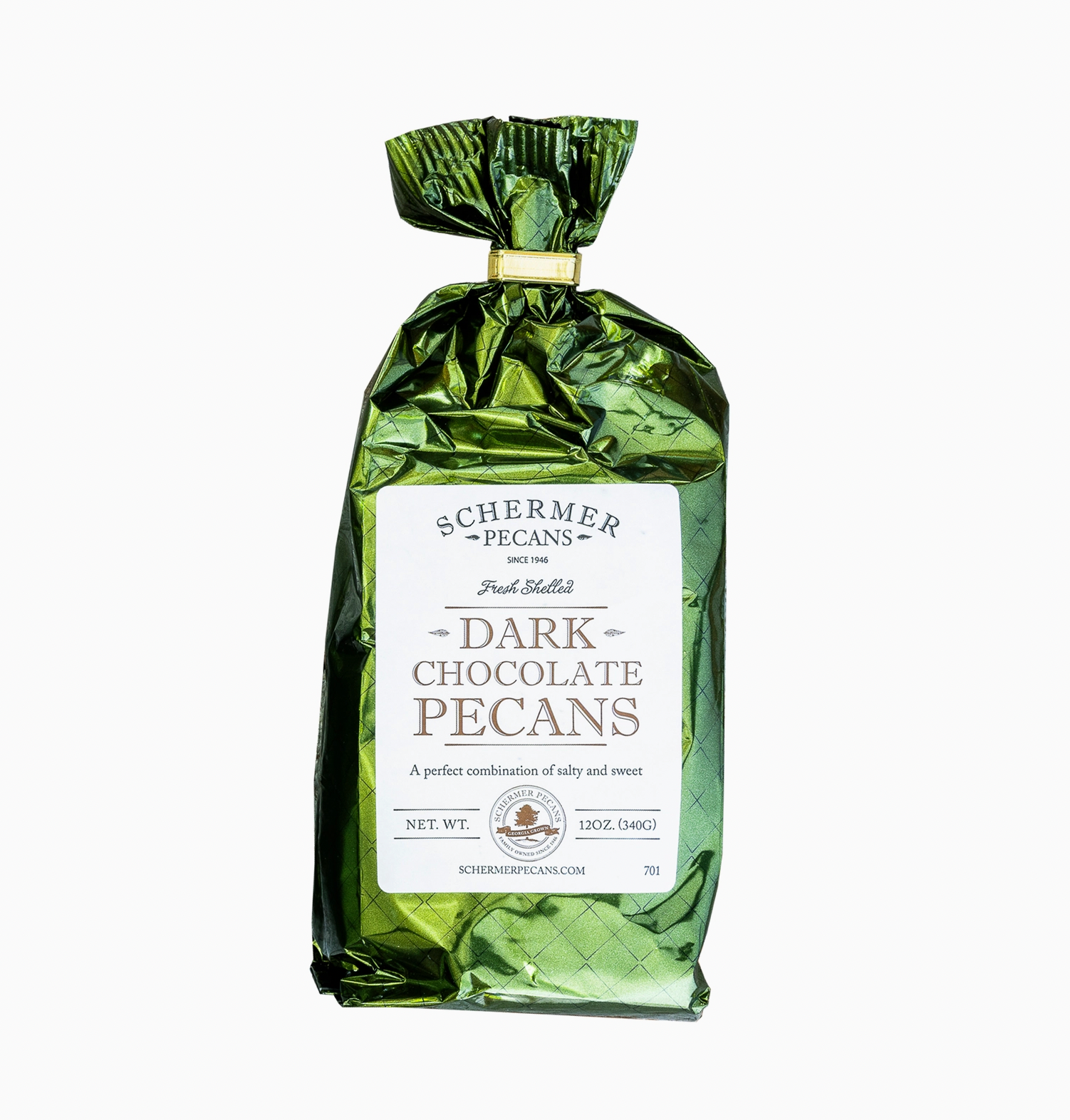 Dark chocolate coated Schermer Pecans have been grown in Georgia, freshly shelled and roasted in salt.