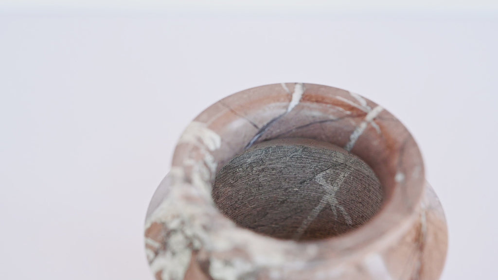 This stunning vase has been hand carved from a stunning pink marble. Solid with a beautiful shape. We love this vase on a bookshelf or on a counter holding our beautiful dried floral bouquets.