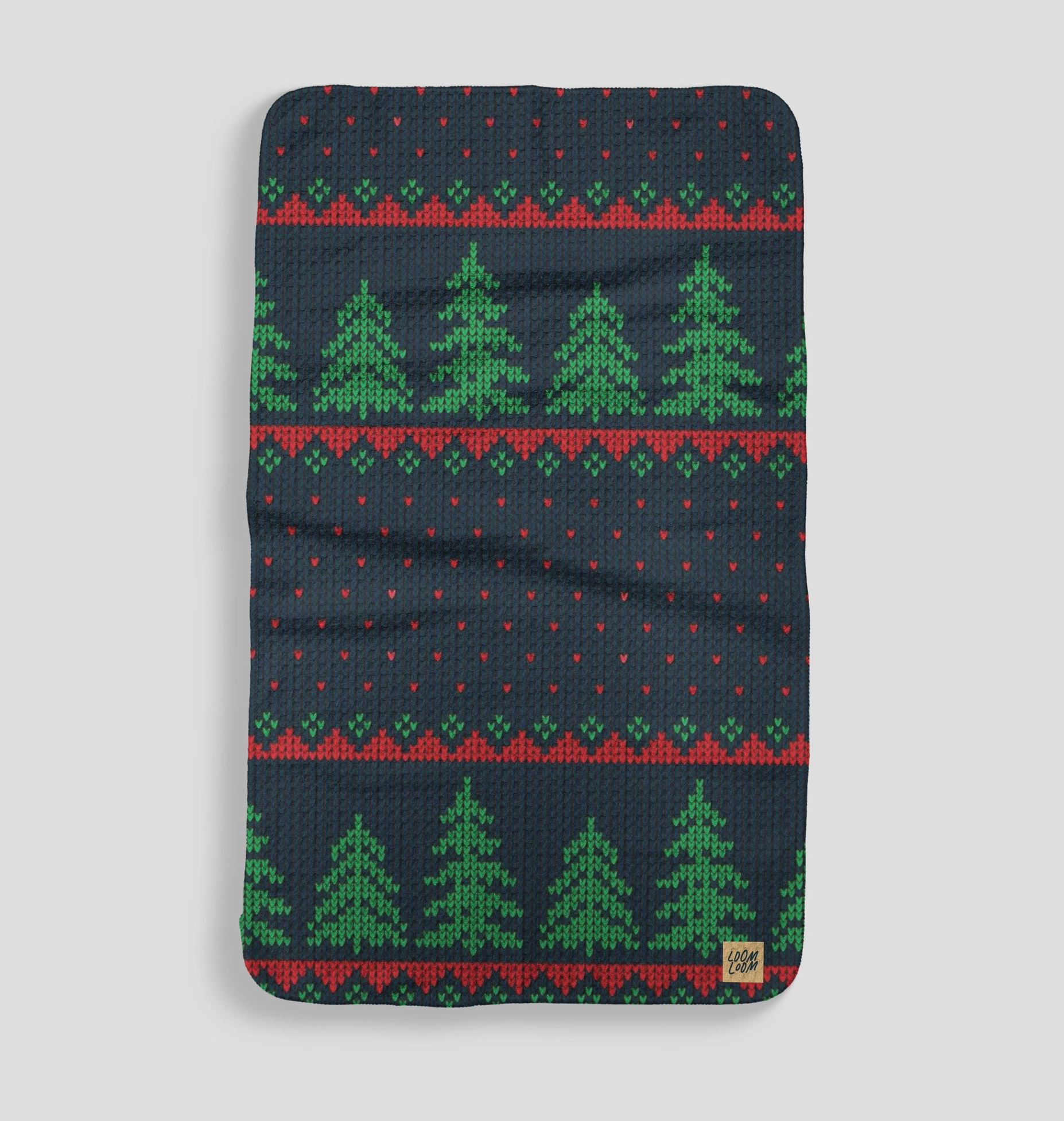 A kitchen towel with navy background and classic red and green Christmas sweater pattern. This towel has a double sided print.
