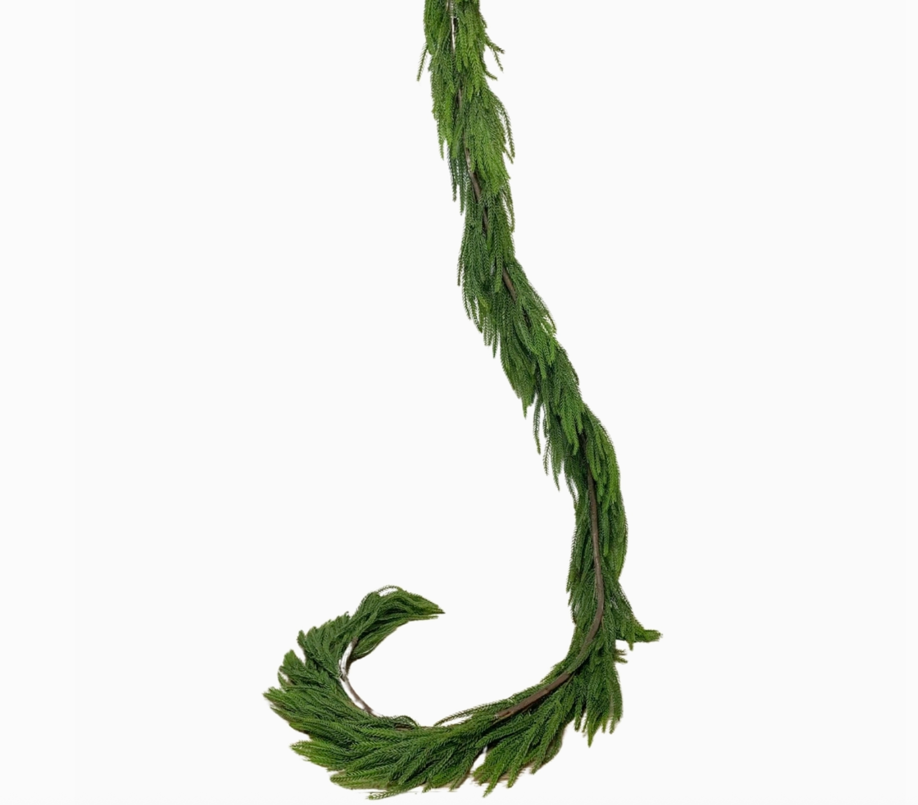 A thick Norfolk pine garland that has a real touch feel. The garland has a brown wire loop end to help easily secure the garland into place. Long Norfolk sprigs drape in a natural way. Stunning along a mantle, railing and long counters.