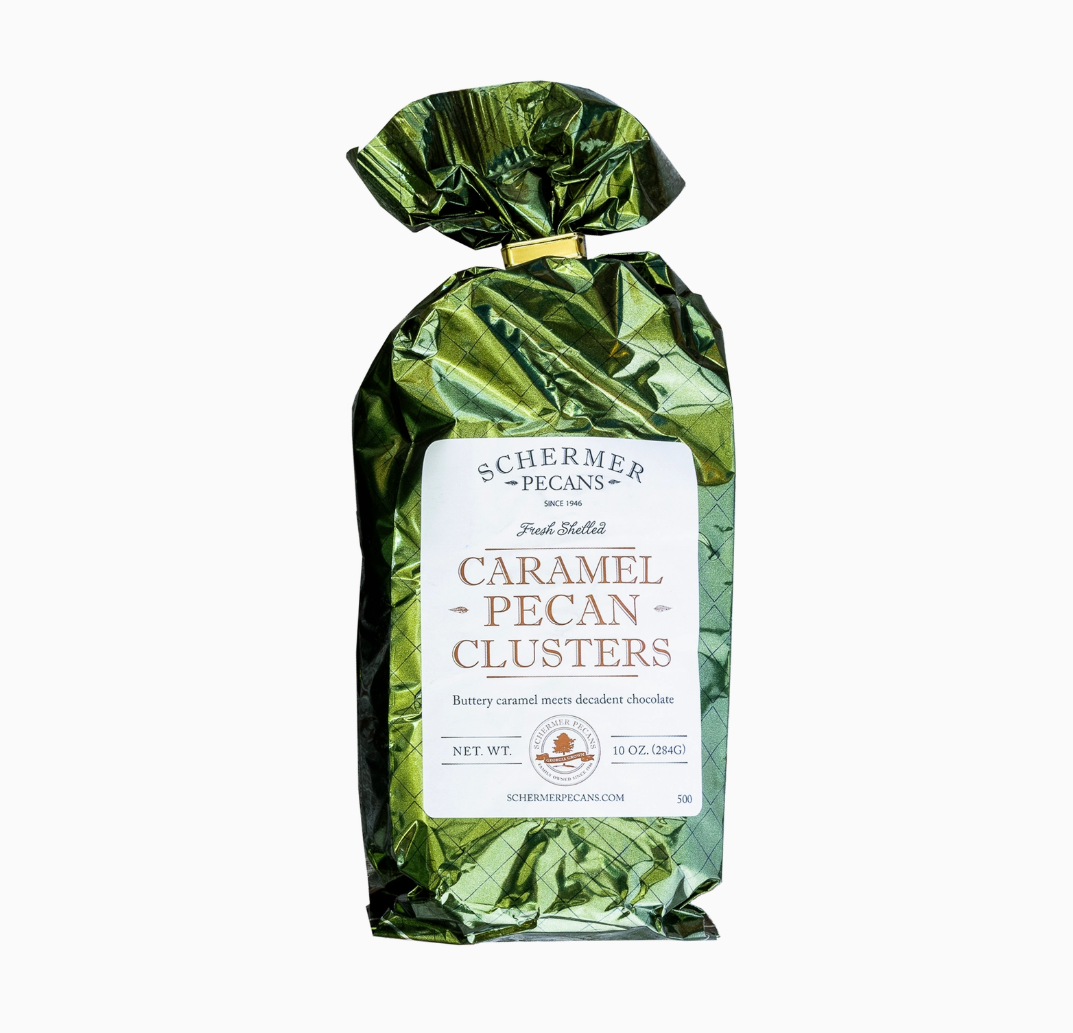 Milk chocolate and caramel coated Schermer Pecans have been grown in Georgia, freshly shelled and roasted in salt.