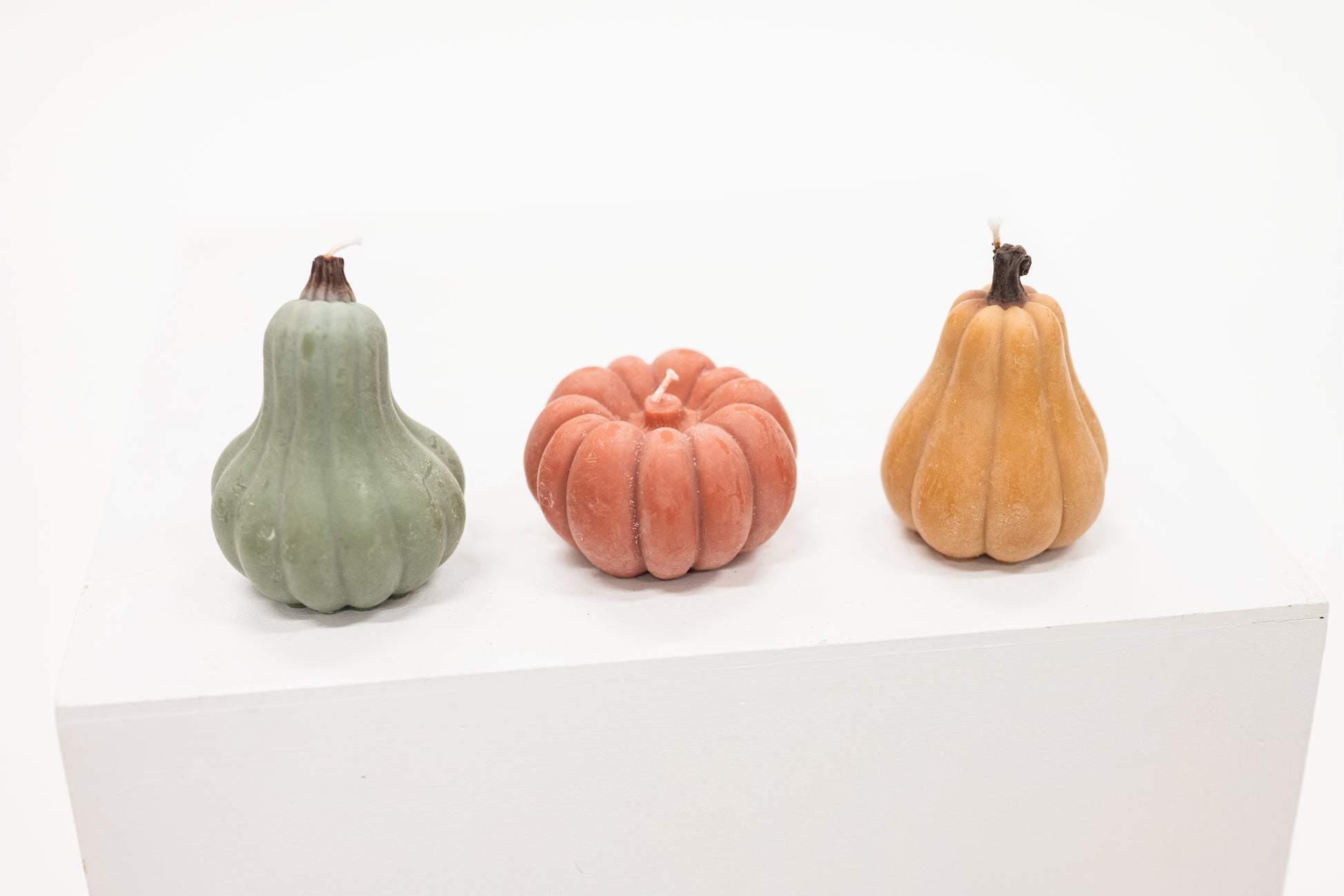A cozy trio of pumpkin candles are perfect for celebrating the fall and Thanksgiving seasons. Handcrafted candles in two different shaped pumpkins and packaged in a kraft box. Terracotta orange, olive green and butterscotch yellow pumpkins.