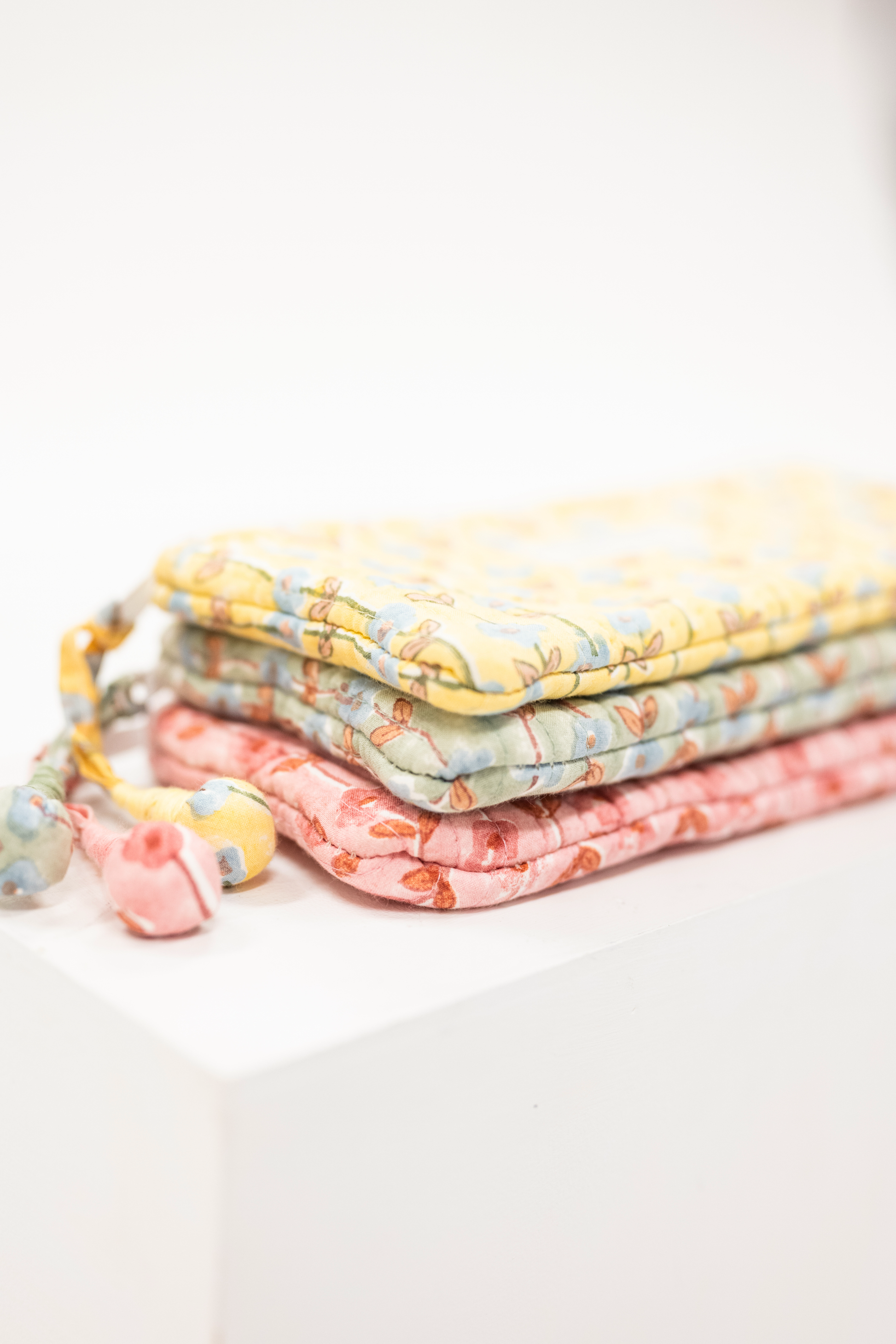 A quilted zip pouch case for holding pencils or other objects. Ethically made in India by a family company that focuses on zero waste production.
