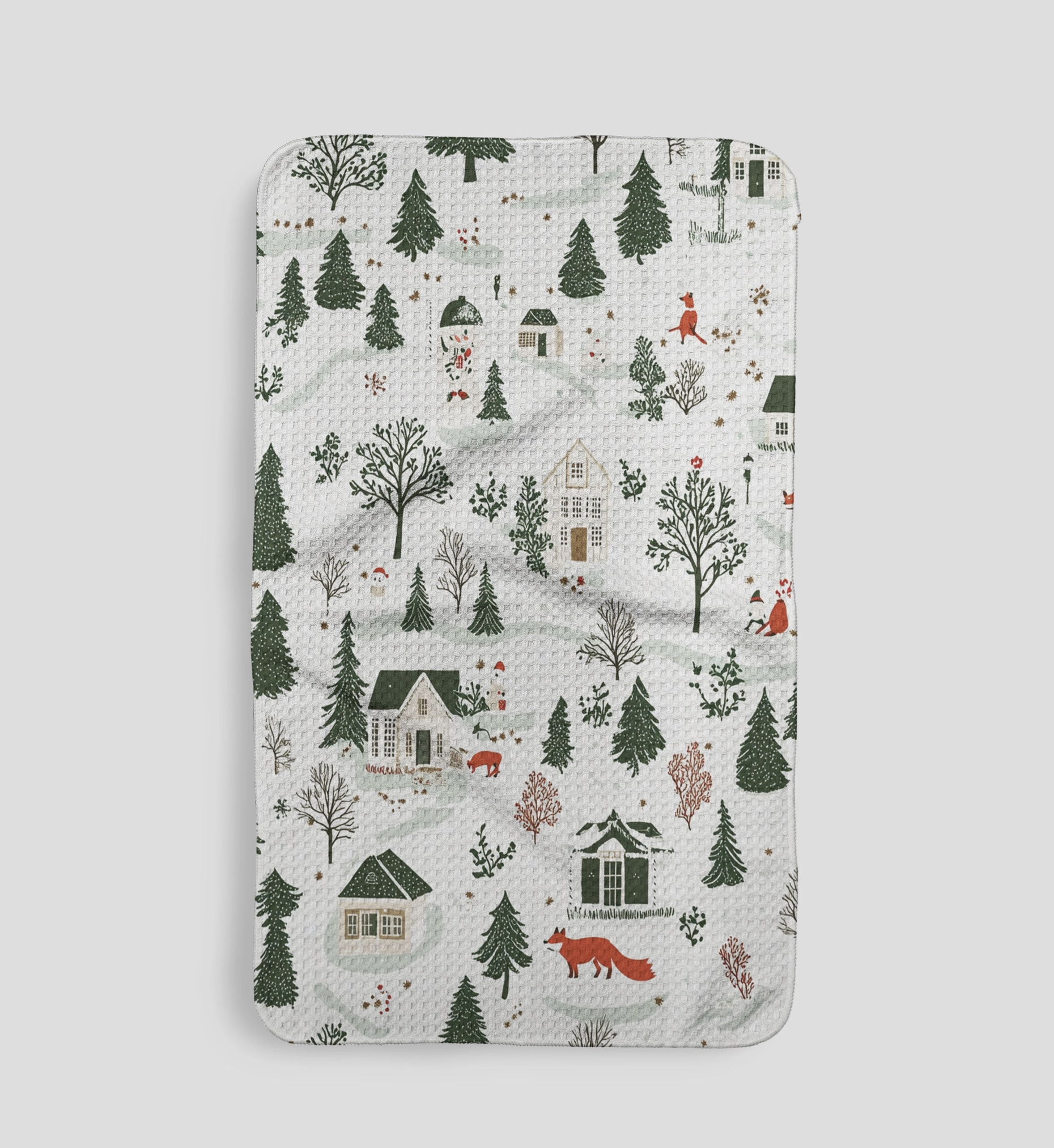 A kitchen towel with a neutral background and a print showing a snowy village. This towel has a double sided print.