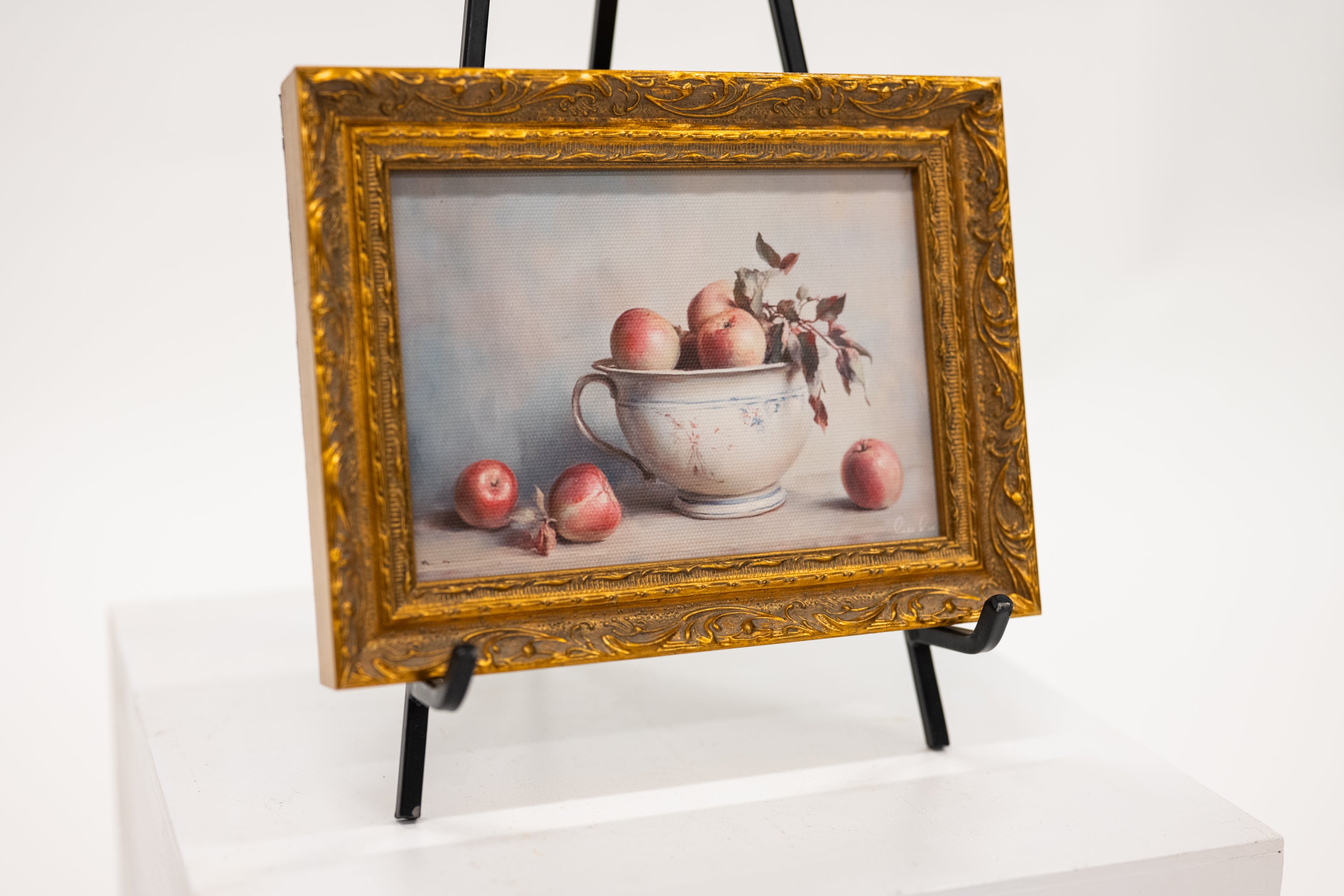 Vintage art reproduction of a bowl of apples. This comes encased in a quality frame. Frame showcases a gold frame with an antique French style.