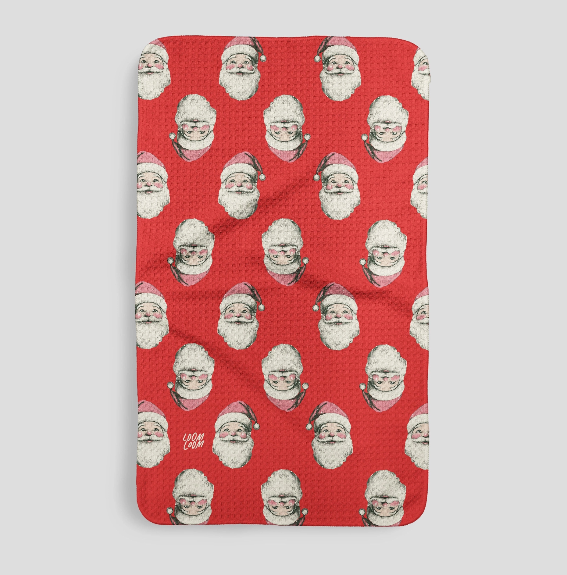 A kitchen towel with a red background and a vintage Santa face pattern. This towel has a double sided print.
