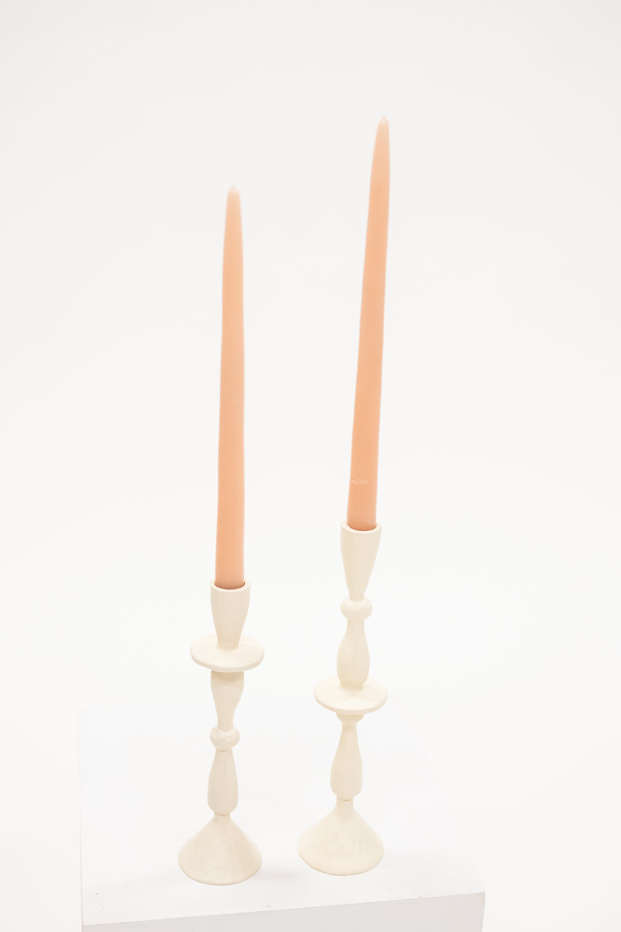 A hand forged aluminum candlestick with an off-white coating. This neutral colored candle taper holder is perfect for decorating your table or mantle for the changing seasons.